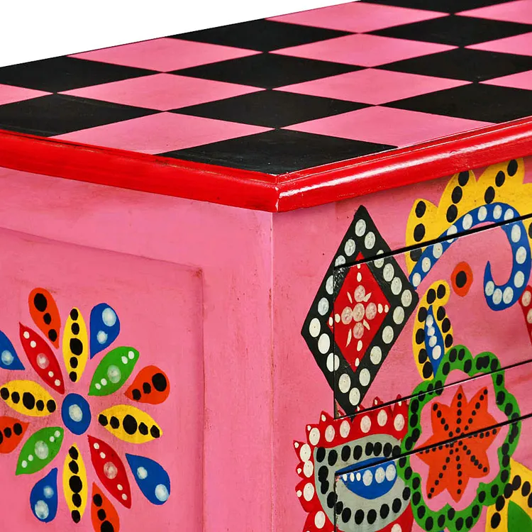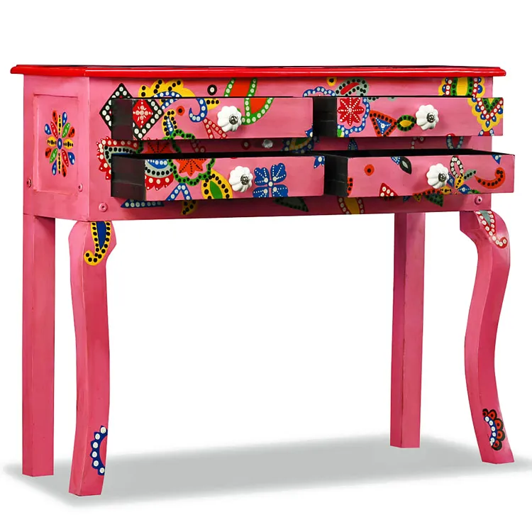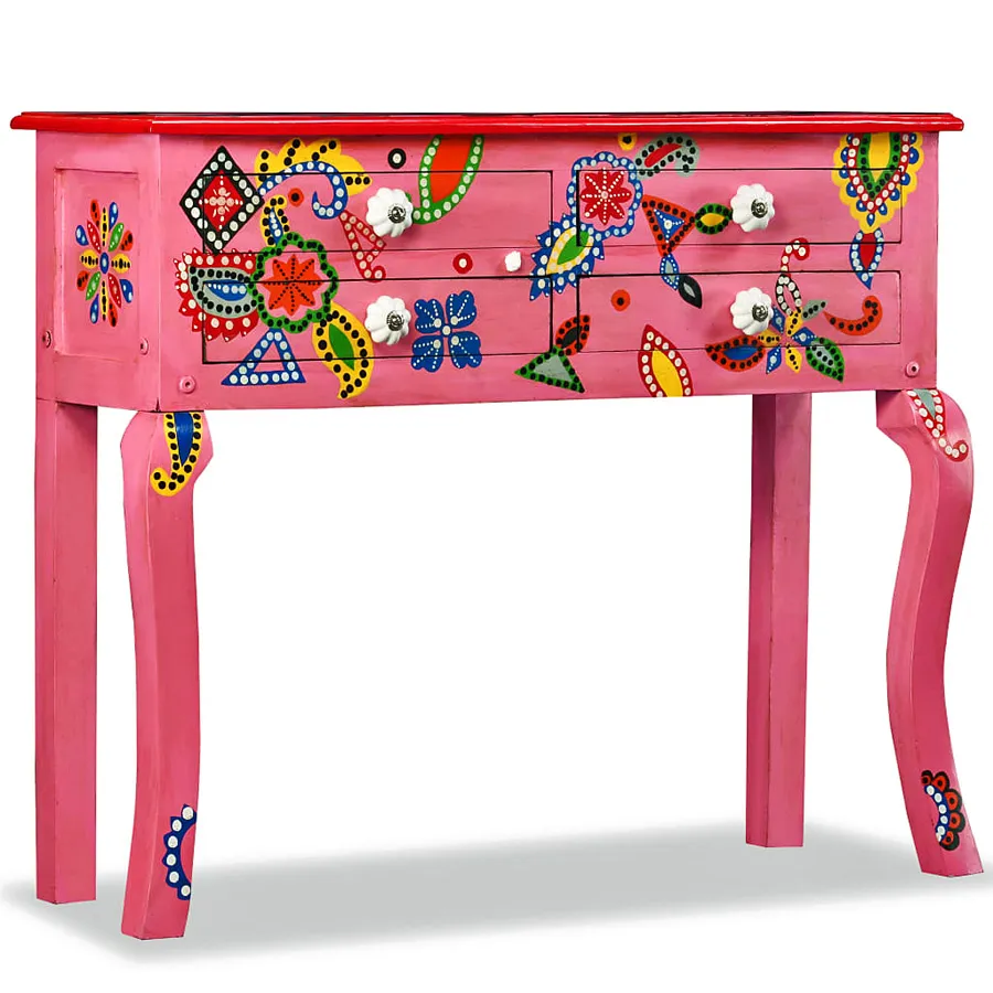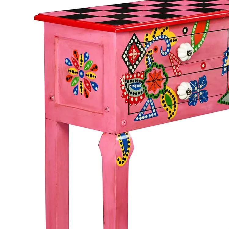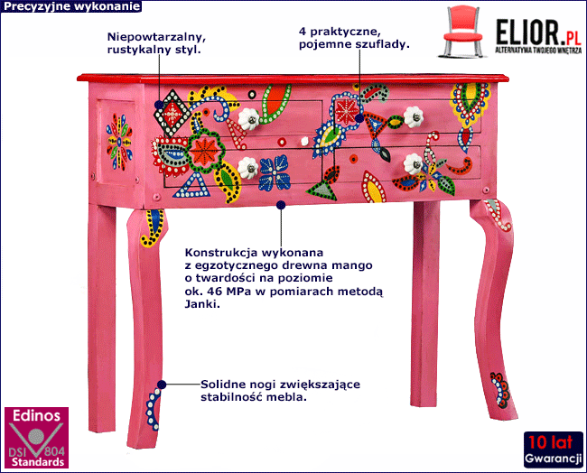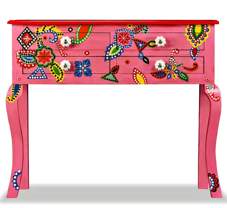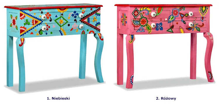 Fosi jest nietuzinkową konsolą, która swoim projektem łamie wszelkie utarte schematy. Jedna para nóg jest prosta, natomiast długa powyginana, posiadająca nieszablonowe kształty. Osobliwy, żywy kolor świetnie odróżni się na tle innych mebli, zapobiegając zlewaniu się konsoli z tłem. Prawie cała powierzchnia mebla pokryta została kolorowymi, rustykalnymi wzorami malowanymi ręcznie, które spowodują zachwyt każdego, kto na nie spojrzy. Twoi goście będą zachwyceni szykownym i wyrafinowanym designem tego stolika. Fosi posiada 4 pojemne szuflady, dzięki którym zyskasz sporą ilość miejsca do przechowywania wszelkich drobiazgów niezbędnych w codziennym życiu. Charakterystyczne uchwyty ułatwią otwieranie szuflad, będąc jednocześnie unikatowym elementem dekoracyjnym. Kolorowy blat idealnie nadaje się do eksponowania przedmiotów dekoracyjnych, takich jak wazony, albumy ze zdjęciami czy kosze z owocami. Ogromna liczba zastosowań sprawia, że konsola ta świetnie sprawdzi się w salonie, przedpokoju, pracowni lub sypialni.