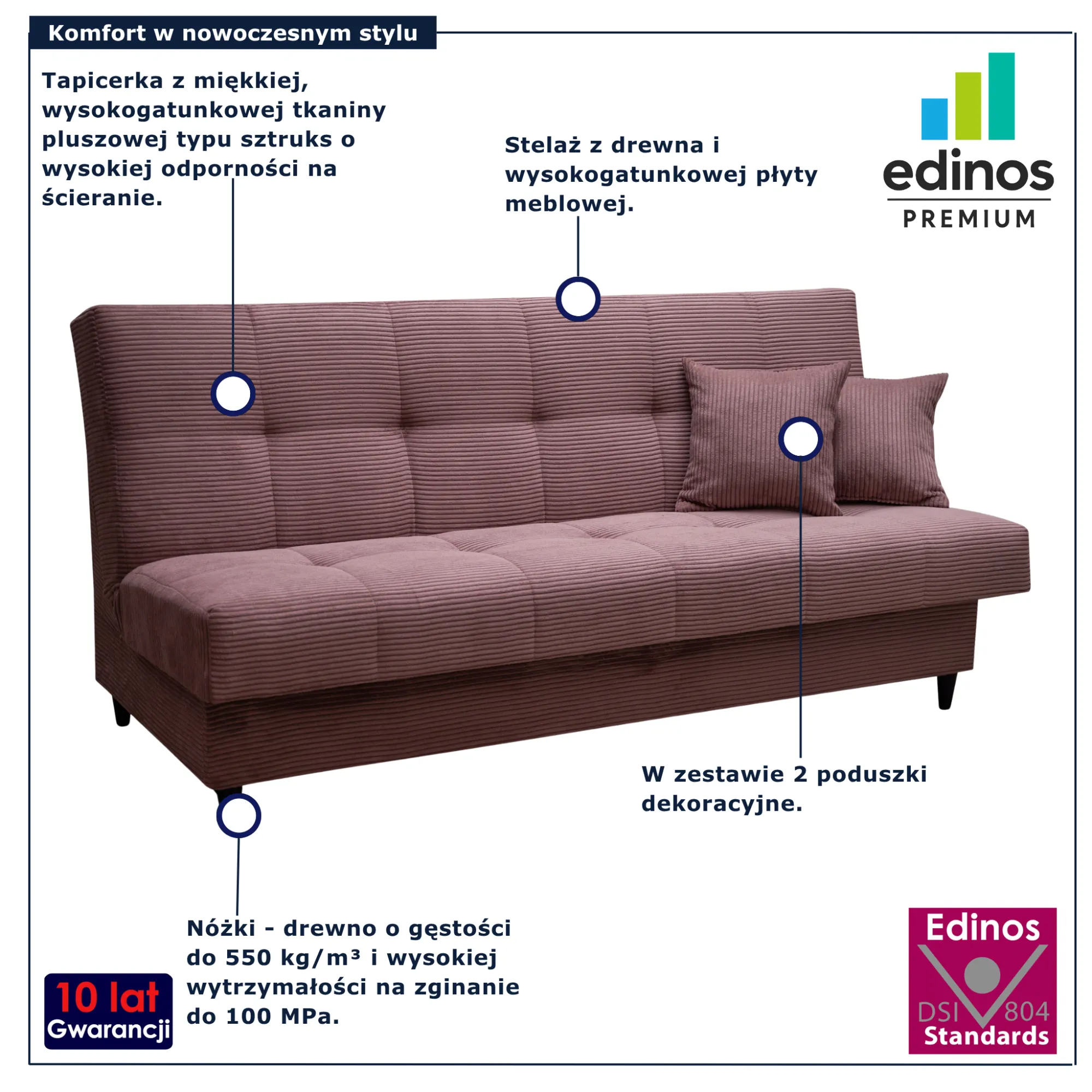 • Produkt posiada certyfikat jakości "Edinos Standards DSI 804", który potwierdza najwyższą jakość wykonania mebla oraz pełny stopień zgodności poszczególnych jednostek wytworzonego wyrobu z przyjętym wzorcem.