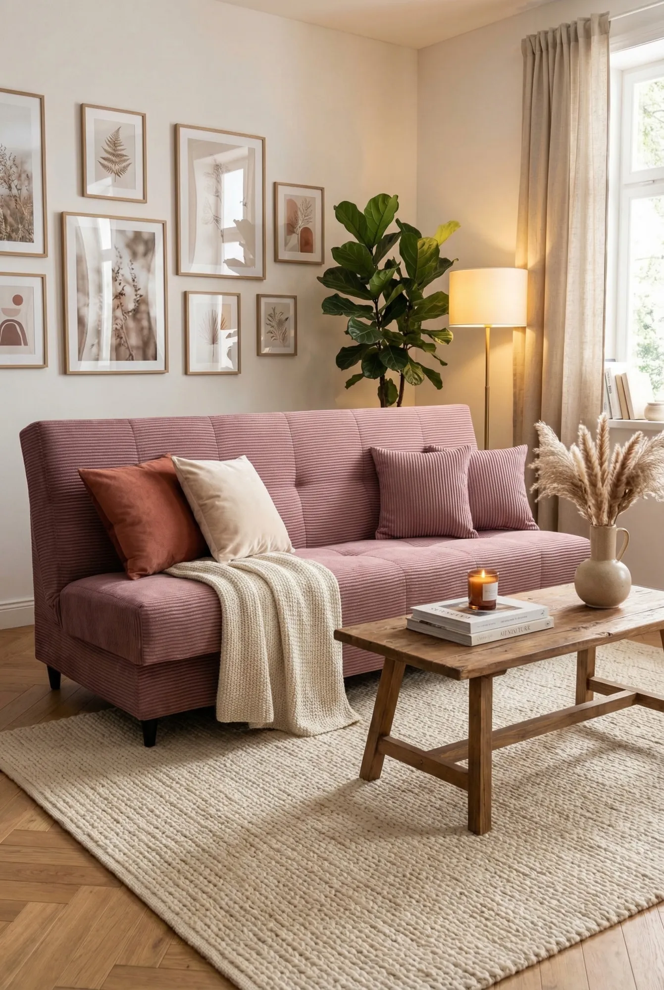 Salon skandynawski z różową wersalką Garitia