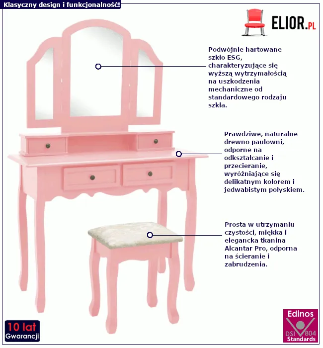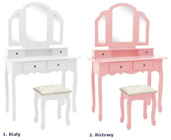 • Kolor toaletki: różowy, kolor siedziska: biało-złoty. Szukasz innych toaletek do swojego wnętrza? Kliknij w link i sprawdź oferowane przez nas toaletki w sklepie Edinos.pl. Stwórz swój praktyczny zestaw mebli.