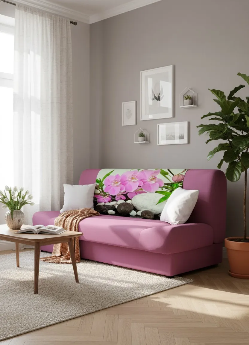Różowa wersalka rozkładana z motywem kwiatów - Piovia 5X