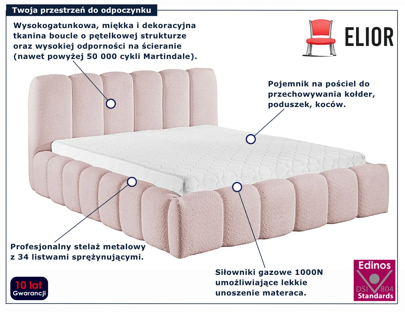 Łóżko prezentuje się bardzo elegancko. Tkanina boucle jest przyjemna w dotyku i dobrze komponuje się z resztą wnętrza. Montaż był prosty, a pojemnik na pościel funkcjonalny. Jednakże, przy intensywnym użytkowaniu, materiał może wymagać szczególnej troski, aby zachować swój wygląd.
