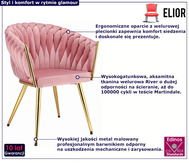 Przepiękne krzesło Azrel to połączenie elegancji i nowoczesnego designu, które przyciąga wzrok wyjątkowymi detalami. Styl glamour spotyka się tutaj z komfortem, tworząc mebel, który wyróżnia się nie tylko wyglądem, ale także wygodą. Zestawienie aksamitnego weluru ze złotym stelażem to dopiero początek, a dekoracyjna plecionka na oparciu to eksplozja wizualnych doznań. Jesteśmy pewni, że chcesz mieć to niesamowite krzesło!