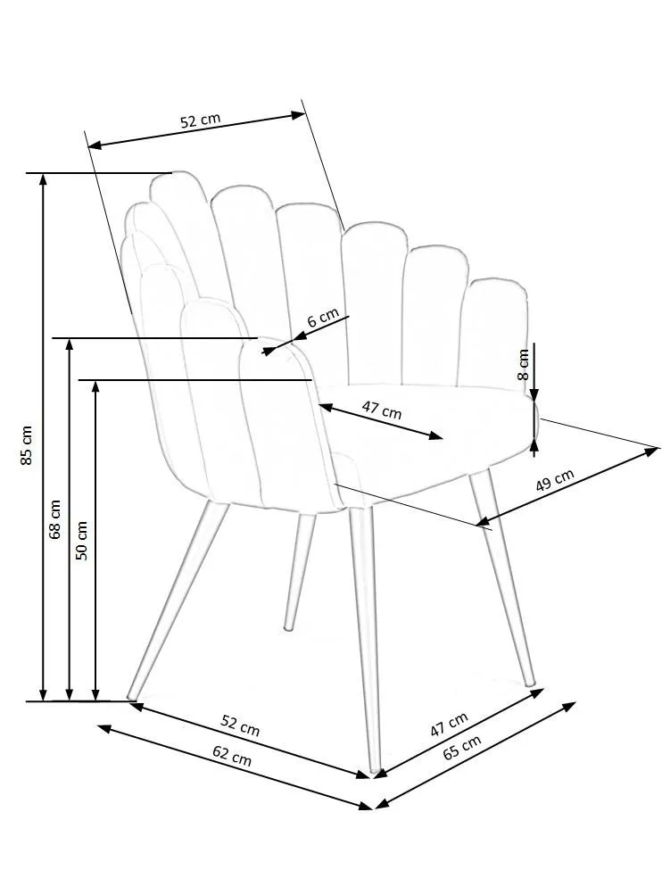 Wymiary: szerokość mebla: 65 cm, szerokość siedziska: 49 cm, głębokość mebla: 62 cm, głębokość siedziska: 47 cm, wysokość całkowita: 85 cm, wysokość siedziska: 50 cm.