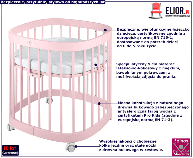 Niedługo na świecie przywitasz swoje dziecko, a może już tulisz je w ramionach. Sporo czytasz o pielęgnacji, diecie i potrzebach maluszka. Z radością kupujesz mięciutkie kocyki, delikatną w dotyku pościel, przeglądasz strony internetowe w poszukiwaniu kołyski dla noworodków. Już pewnie wiesz, że za kilka miesięcy będziesz szukać pierwszego „prawdziwego” łóżeczka dla niemowlęcia, a chwilę później większego mebla dla kilkuletniego szkraba. To, że dzieci szybko rosną, a wraz z tym –  rosną ich potrzeby, jest oczywiste. To, że nie musisz kupować co roku nowego dziecięcego łóżka  - nie zawsze jest takie jasne. Ale od czego są specjaliści marki Elior? Jako doświadczeni designerzy i jednocześnie rodzice 1,5 - rocznej Igi, 3 - letniej Ali, 5 - letniego Jaśka i Tymka, którego poznamy za 3 miesiące, mamy dla Ciebie wyjątkową propozycję. Wielofunkcyjne różowe łóżeczko Nigras 7X marki Elior to genialny mebel stworzony z myślą o dzieciach i ich zmieniających się z wiekiem potrzebach. Mistrzowski projekt umożliwia łatwe i bezproblemowe przekształcenie łóżeczka w 7 praktycznych i funkcjonalnych mebli. Nigras 7X z bezpiecznego łóżeczka dostawnego dla noworodka można łatwo zamienić w samodzielne łóżeczko dla niemowlęcia lub funkcjonalny przewijak. W ciągu dnia można znacznie obniżyć dno łóżeczka i przekształcić je w kojec, w którym dziecko będzie się bezpiecznie bawiło. Kiedy Twoje dziecko podrośnie, wystarczy zamontować środkowe panele i obniżyć podstawę materaca i można się cieszyć komfortowym łóżeczkiem dla kilkuletniego szkraba. A gdy Twój maluszek zamieni się w rezolutnego przedszkolaka, łóżko możesz przekształcić w wygodny stolik z dwoma krzesłami, idealny do prac plastycznych, tworzenia budowli z klocków, czy grania w planszówki. Montaż łóżeczka Nigras 7X oraz zamiana na kolejne warianty jest wyjątkowo szybka, prosta i intuicyjna, co sprawia, że poradzi sobie z nią każdy rodzic.
