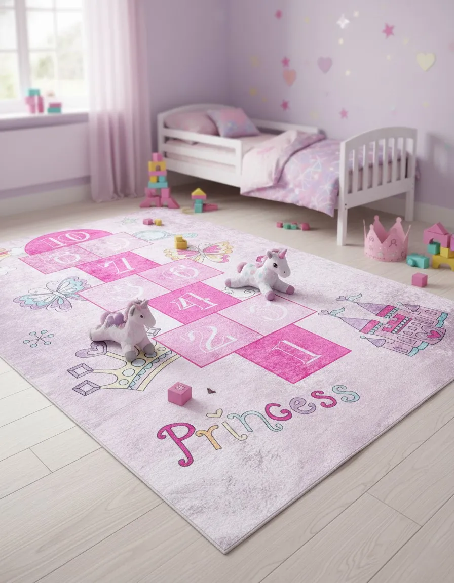 Różowy dywan dziecięcy z grą w klasy dla dziewczynki - Belmo 3X