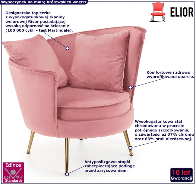 • Kolor: Tapicerka w kolorze różowym, nóżki złote. Sprawdź także inne fotele glamour w sklepie Edinos.pl. Stwórz swój praktyczny zestaw mebli.