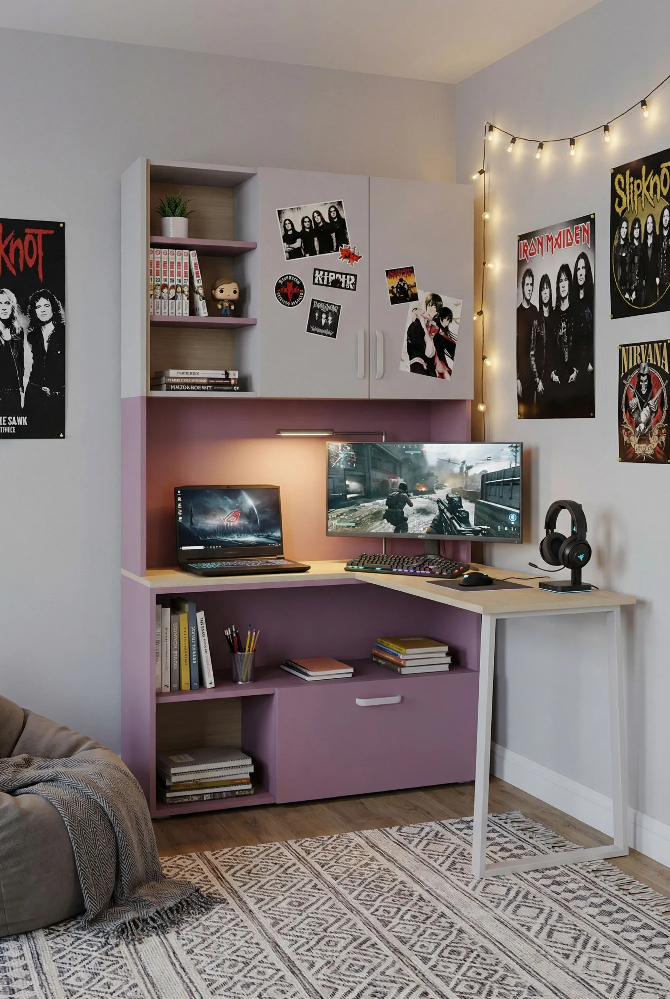 Szczerze to regał z narożnym biurkiem świetnie sprawdza się w pokoju mojej córki, bo daje miejsce do nauki i przechowywania w jednym. Kolorystyka kaszmir z różowym jest łagodna i ładnie ożywia pokój.