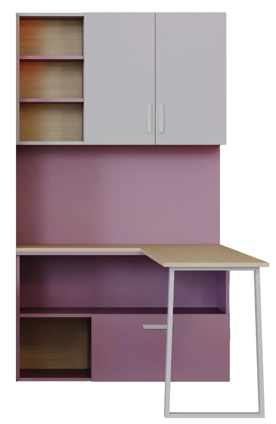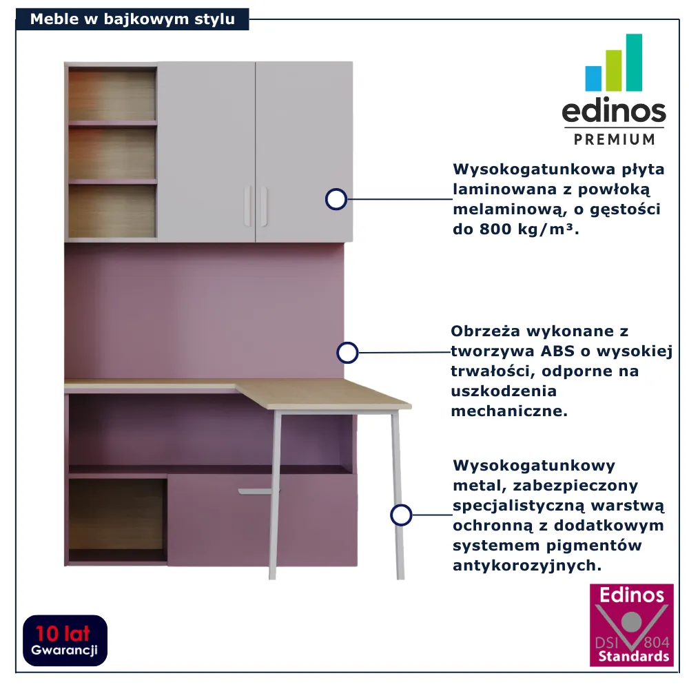 • Zamykane szafki, otwarte półki i dolne schowki – przestrzeń na książki, zeszyty, przybory szkolne i dekoracje.