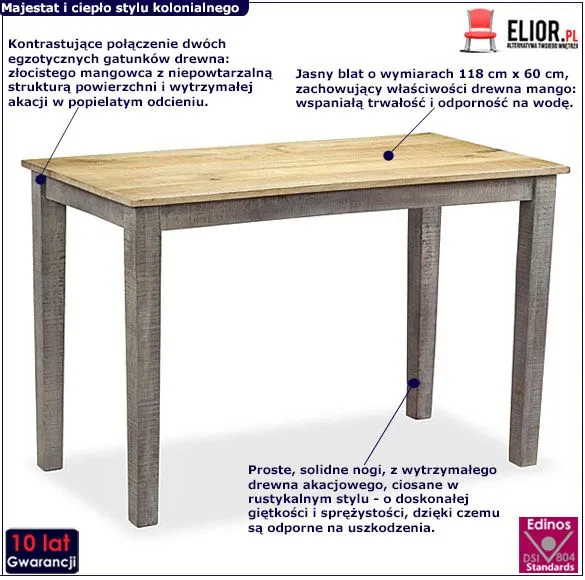• Egzotyczne drewno w rustykalnym wydaniu, mebel o wielu twarzach, pasujący do wielu stylów wnętrz - zobacz też inne stoły drewniane w sklepie Edinos.pl - na pewno znajdziesz coś dla siebie!