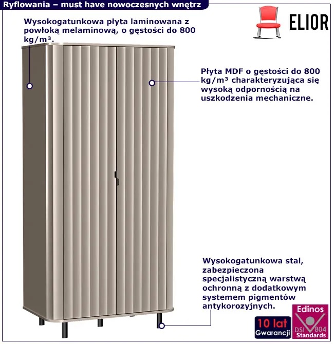 Szafa Egesio 10X marki Edinos Premium to połączenie smukłej formy i imponującej pojemności, dzięki której bez trudu uporządkujesz garderobę lub wyposażenie domowe. Za dwoma ryflowanymi frontami kryje się praktyczny układ półek oraz drążek na ubrania – idealny zarówno do salonu, jak i przedpokoju, sypialni czy pokoju gościnnego. Wysoka forma na smukłych nogach dodaje jej lekkości, a przemyślany podział wnętrza sprawia, że bez trudu pogodzisz przechowywanie rzeczy wiszących i składanych. To mebel, który łączy nowoczesną estetykę z realną wygodą użytkowania.