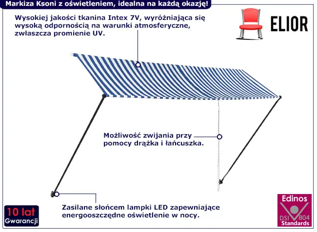 • Kolor: niebiesko-białe pasy. Kliknij w link i sprawdź także inne markizy ogrodowe w sklepie Edinos.pl. Stwórz swóją praktyczną przestrzeń.