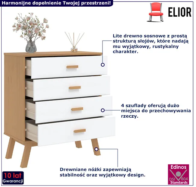 Dotyczy: Sosnowa brązowa komoda z 4 szufladami - Krebri 3X