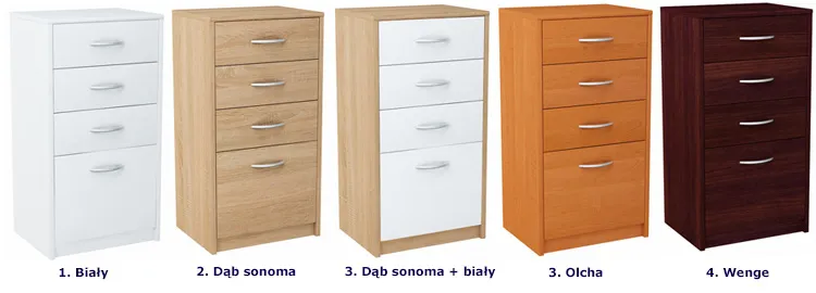 Poniżej przedstawiamy Ci wszystkie wersje kolorystyczne komody Huso 4X marki Edinos Premium. Chcesz zobaczyć inną wersję? Zapraszamy tutaj.