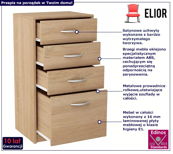 - Produkt posiada certyfikat jakości "Edinos Standards DSI 804", który potwierdza najwyższą jakość wykonania mebla oraz pełny stopień zgodności poszczególnych jednostek wytworzonego wyrobu z przyjętym wzorcem.
