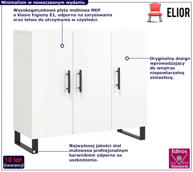 • Produkt posiada certyfikat jakości "Edinos Standards DSI 804", który potwierdza najwyższą jakość wykonania mebla oraz pełny stopień zgodności poszczególnych jednostek wytworzonego wyrobu z przyjętym wzorcem.