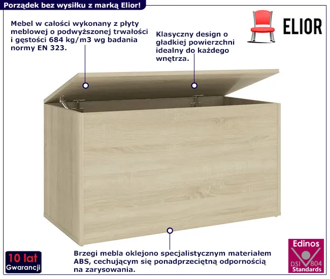 Znudziła Ci się szafa przepełniona pościelą i kołdrami? A może szukasz praktycznego sposobu na przechowywanie pościeli, który nie zajmie wiele miejsca? Jeśli tak, to mamy dla Ciebie idealne rozwiązanie - klasyczną, prostokątną skrzynię na pościel Kerix marki Elior! Dostępna w bogatej kolorystyce, pozwoli dopasować się do każdego stylu i koloru Twojego domu. Doskonale wpisze się w aranżacje klasyczne oraz nowoczesne. Jako producent z wieloletnim doświadczeniem, gwarantujemy, że nasza skrzynia na pościel spełni wszystkie Twoje oczekiwania. Solidna konstrukcja i staranność wykonania sprawiają, że nasz produkt pozostanie z Tobą przez wiele lat. Dzięki niej, Twoja pościel i kołdry będą zawsze schludnie posegregowane i gotowe do użytku.