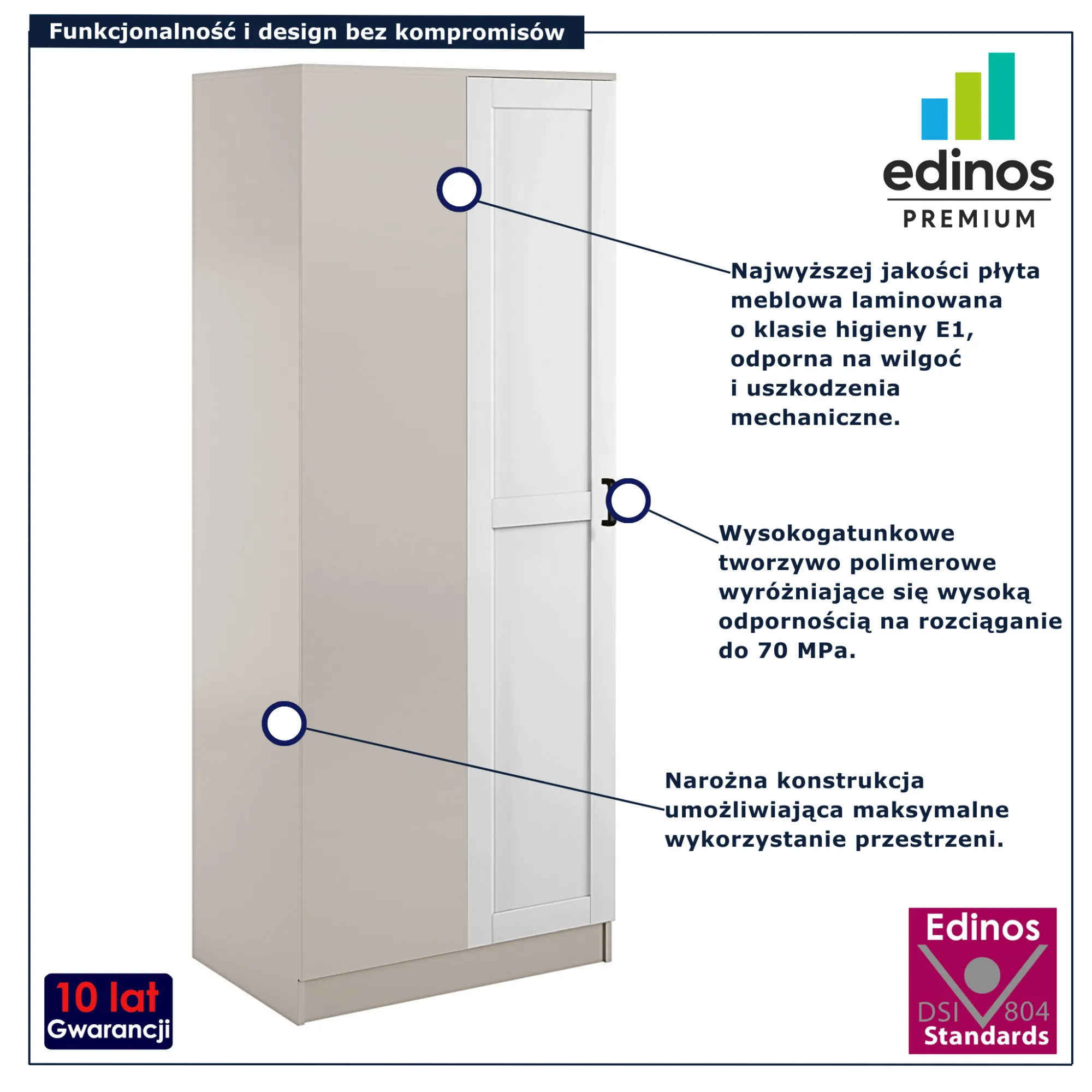 • Produkt posiada certyfikat jakości "Edinos Standards DSI 804", który potwierdza najwyższą jakość wykonania mebla oraz pełny stopień zgodności poszczególnych jednostek wytworzonego wyrobu z przyjętym wzorcem.