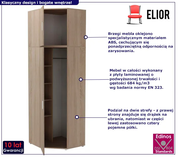 Masz już jedną szafę, ale niestety nie mieścisz się w niej ze swoimi rzeczami? Mamy świetne rozwiązanie w postaci narożnej szafy Xato 4X marki Elior. Xato 4X to mebel, który nie zajmie dużo miejsca w Twojej sypialni, ale da Ci sporo dodatkowej przestrzeni do przechowywania. Cztery pojemne półki oraz drążek na wieszaki to świetne rozwiązanie, dzięki któremu zyskasz dodatkową przestrzeń na swoje ubrania. Możliwość montażu drzwi zarówno na lewą, jak i prawą stronę to dodatkowe zalety, dzięki którym ustawisz ją w każdej wolnej przestrzeni. Klasyczna forma oraz stonowane kolory to gwarancja, że idealnie wkomponuje się do pomieszczeń zarówno w stylu klasycznym, skandynawskim, nowoczesnym jak również nowoczesnym!