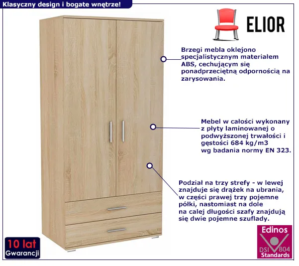 Warto mieć świadomość tego, że często gromadzimy ubrania, których nie nosimy. Zalegają one na półkach i wieszakach, czekając na właściwą okazję. W rezultacie w naszej szafie znajduje się cała sterta ubrań, których nie umiemy ze sobą połączyć. Dlatego po pierwsze warto od czasu do czasu zrobić mały remanent w szafie, a po drugie zaopatrzyć się w mebel, który pomieści ulubione ubrania. Idealną propozycją jest szafa Foni 3X marki Edinos Premium, która została podzielona na trzy strefy - w lewej znajduje się drążek na ubrania, w części prawej trzy pojemne półki, natomiast na dole na całej długości szafy zamontowano dwie pojemne szuflady! Klasyczna forma, stonowane kolory to gwarancja, że idealnie wkomponuje się do salonu, sypialni, czy pokoju dziecka.