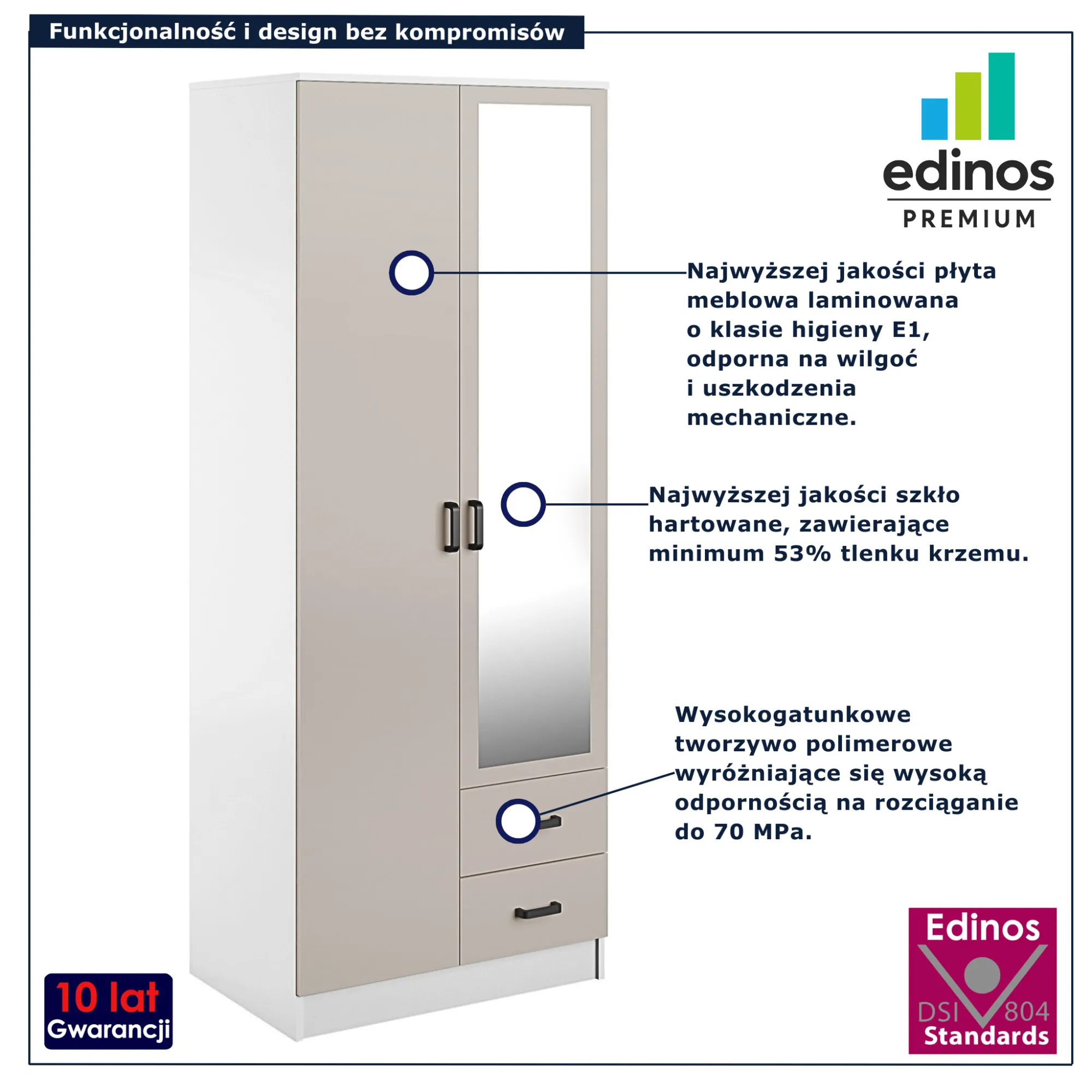 • Produkt posiada certyfikat jakości "Edinos Standards DSI 804", który potwierdza najwyższą jakość wykonania mebla oraz pełny stopień zgodności poszczególnych jednostek wytworzonego wyrobu z przyjętym wzorcem.