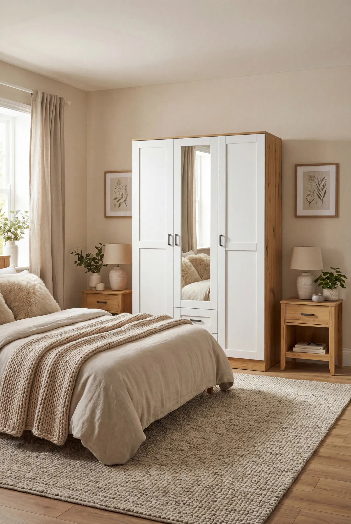 Aranżacja sypialni z wykorzystaniem szafy Lorenix dąb artisan + biały