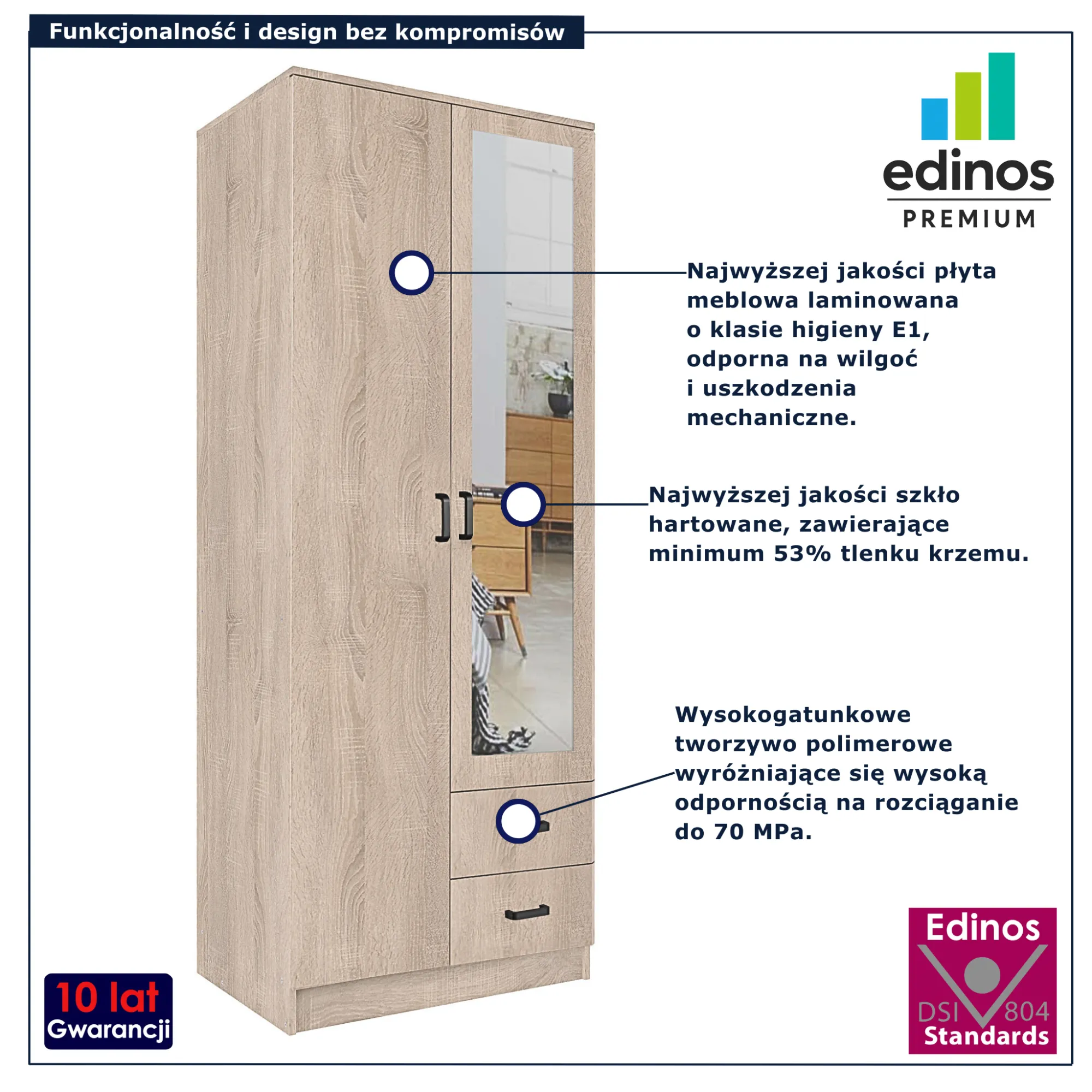 • Produkt posiada certyfikat jakości "Edinos Standards DSI 804", który potwierdza najwyższą jakość wykonania mebla oraz pełny stopień zgodności poszczególnych jednostek wytworzonego wyrobu z przyjętym wzorcem.