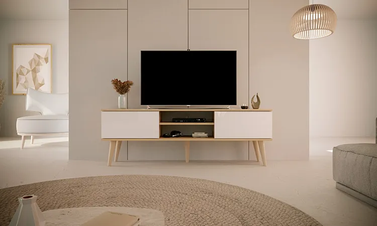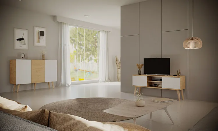 Poniżej prezentujemy przykładową wizualizację wnętrza z wykorzystaniem szafki pod telewizor z kolekcji Tardi: