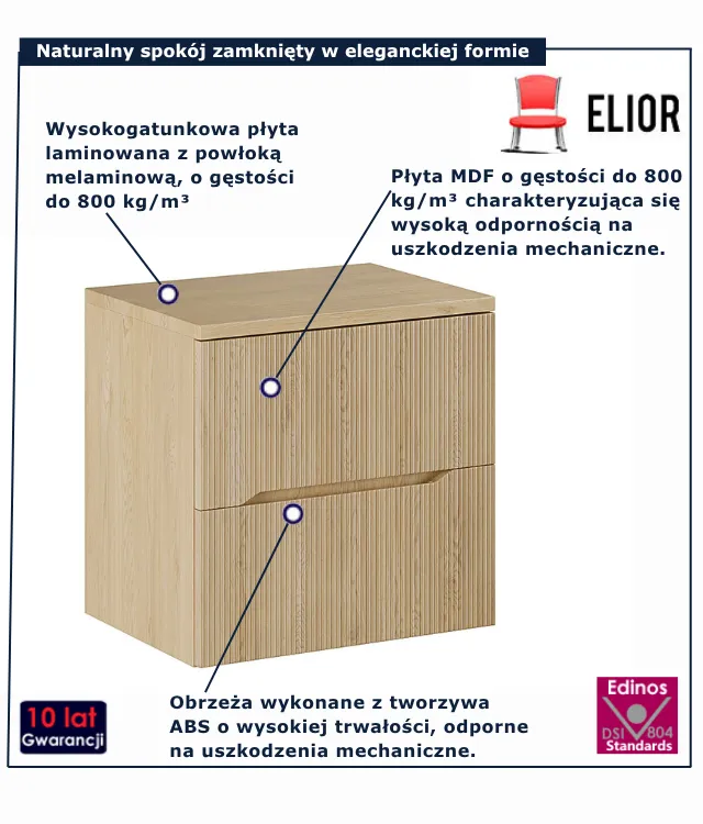 • Produkt posiada certyfikat jakości "Edinos Standards DSI 804", który potwierdza najwyższą jakość wykonania mebla oraz pełny stopień zgodności poszczególnych jednostek wytworzonego wyrobu z przyjętym wzorcem.