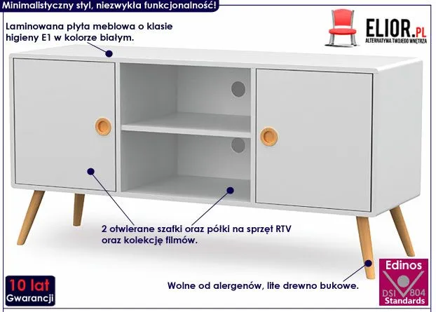 Designerska szafka RTV Ilmnia 5X wyróżnia się nie tylko swoją praktyczną formą i eleganckim kształtem, ale także zastosowaniem materiałów najlepszej jakości. To dlatego cieszy się powodzeniem wśród osób lubiących nowatorskie rozwiązania. Użyta do produkcji stolika laminowana płyta meblowa w kolorze biały mat została uszlachetniona cienkimi filmami melaminowymi. Posiada także specjalne włókna ułożone różnokierunkowo o strukturze sinusoidalnej, co zapewnia nadanie jej cech jakościowych oraz wytrzymałościowych. Nóżki szafki wyprodukowano z wolnego od alergenów naturalnego drewna bukowego, odznaczającego się ponadprzeciętną trwałością i niepodatnością na uszkodzenia mechaniczne. Dwie otwierane szafki oraz dwie półki są wyjątkowo praktyczne i bez problemu pozwalają Ci zmieścić nie tylko odtwarzacz DVD czy kolekcję filmów. Stonowana kolorystyka i prosta forma sprawiają, że szafka pod telewizor Ilmnia 5X doskonale sprawdza się we wnętrzach urządzonych w stylu skandynawskim, minimalistycznym czy nowoczesnym. Szafka marki Elior zapewnia Ci niezapomniane chwile przy ulubionym programie w gronie przyjaciół i rodziny. Zakochasz się w niej od pierwszego wejrzenia!