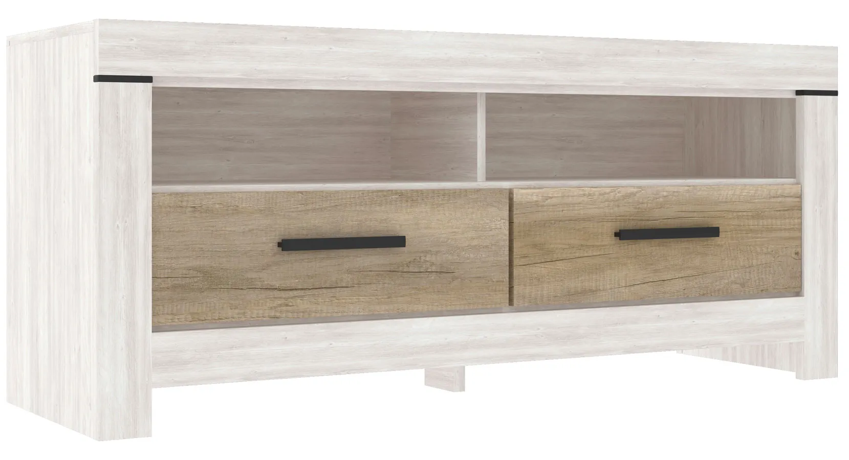 • Dwie przestronne, otwarte półki oferują wygodne miejsce na sprzęt multimedialny i pozwalają na łatwe prowadzenie kabli.