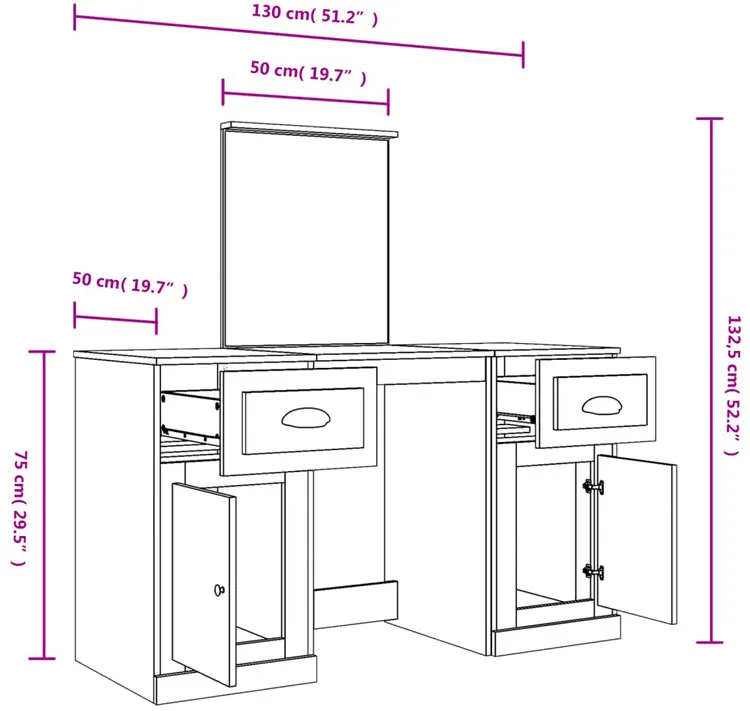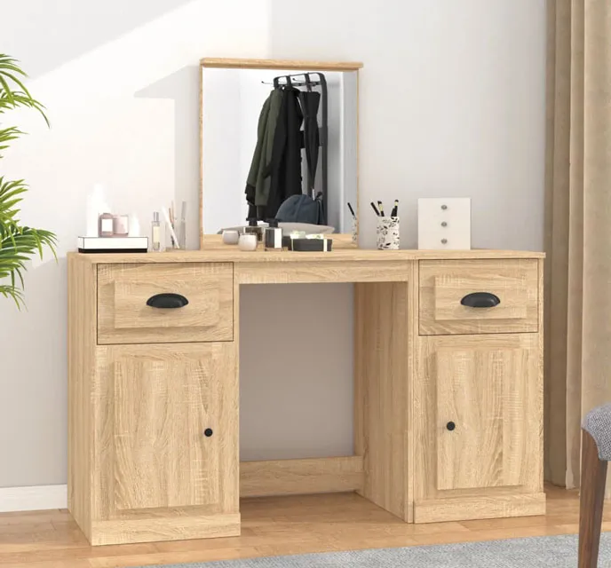 • Obszerne przechowywanie: toaletka oferuje dużo miejsca w 2 szufladach oraz 2 szafkach, co pozwala na uporządkowanie kosmetyków, biżuterii i innych drobiazgów.