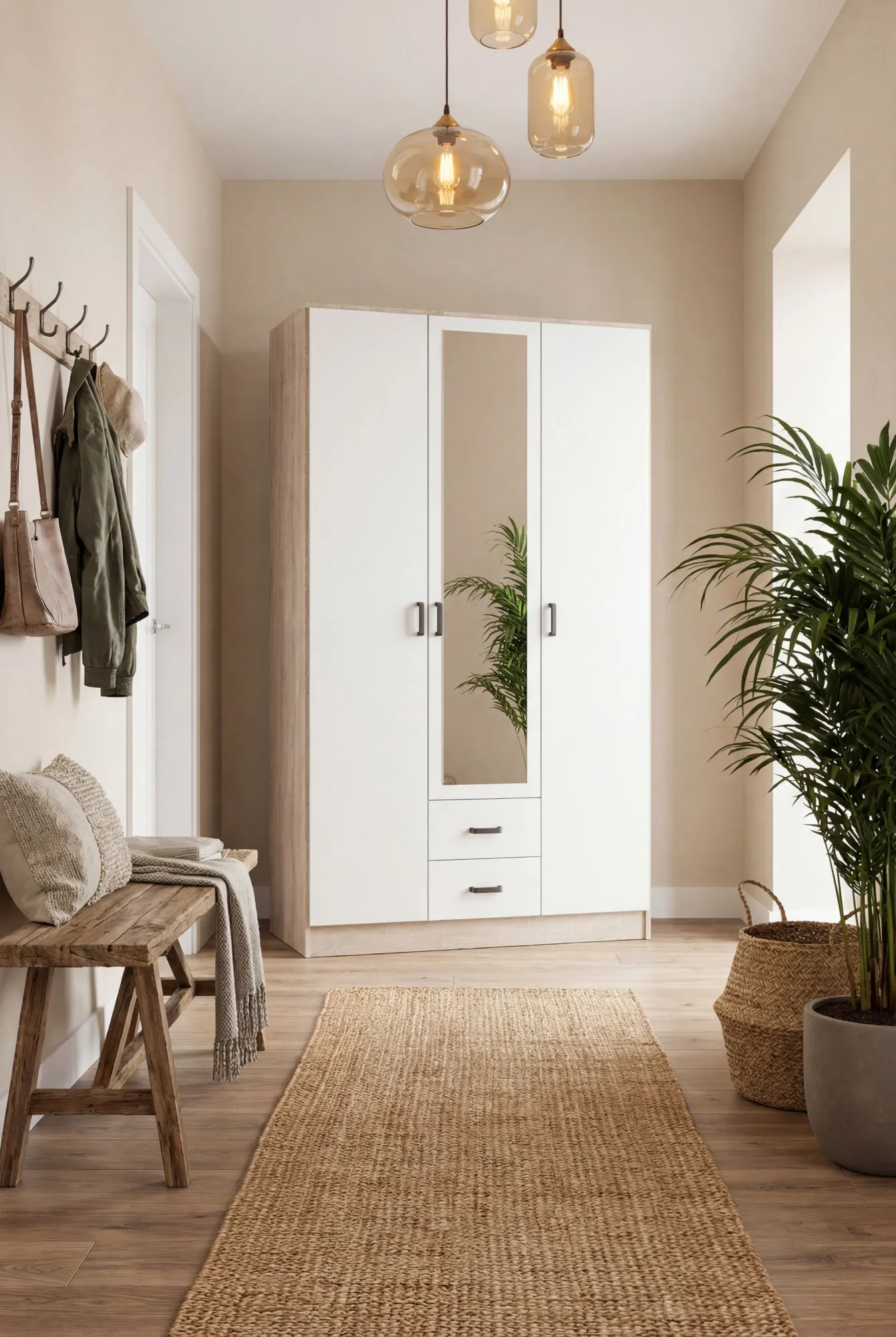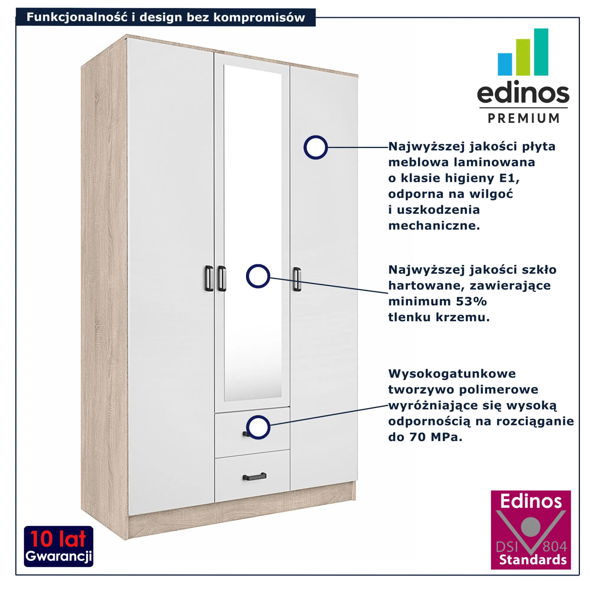 Szafa Montixa marki Edinos Premium to propozycja dla osób, które potrzebują naprawdę dobrze zaplanowanej przestrzeni do przechowywania, bez kompromisów w wyglądzie i wygodzie. Jej szeroka, stabilna bryła sprawia, że idealnie sprawdzi się w sypialni, garderobie lub przestronnym przedpokoju, oferując dużo miejsca na ubrania i dodatki. Centralnie umieszczone lustro wprowadza do wnętrza lekkość, rozjaśnia je i optycznie powiększa, a przy tym staje się praktycznym elementem codziennego użytkowania. Wnętrze szafy zostało zaprojektowane tak, aby maksymalnie ułatwić organizację - drążek na ubrania, pojemne półki oraz dwie dolne szuflady pozwalają utrzymać porządek i szybko odnaleźć wszystko, czego potrzebujesz. Montixa to szafa, która porządkuje przestrzeń i daje poczucie kontroli nad codziennym chaosem.