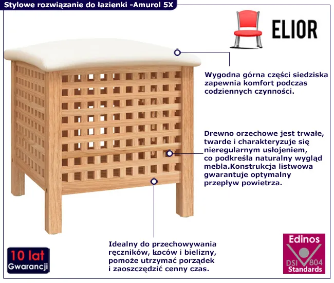 Berton 5X marki Edinos Premium to coś więcej niż zwykły kosz na pranie. Czy wyobrażasz sobie mebel, który łączy w sobie funkcjonalność i nowoczesny rustykalny urok? Ten niezwykły dodatek do Twojej łazienki skrywa tajemnicę – pod miękką poduszką znajduje się praktyczna przestrzeń na pranie. Subtelne połączenie litego orzecha włoskiego z rustykalnym wzornictwem sprawia, że nie tylko zachwyca wyglądem, ale także zapewnia wygodę na co dzień. Nieważne, czy potrzebujesz miejsca na ręczniki, koce, czy przytulnego siedziska do zakładania skarpetek – ten kosz z siedziskiem spełni wszystkie Twoje oczekiwania. Dodając Berton 5X do swojej przestrzeni, zyskujesz nie tylko funkcjonalny mebel, ale też piękny, rustykalny akcent w nowoczesnym stylu.