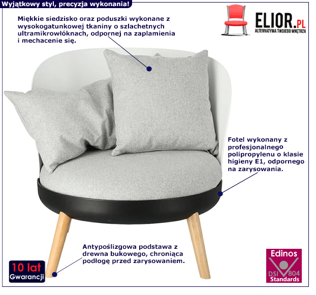 - Modna kolorystyka: szary, czarny, biały, naturalne drewno bukowe. Kliknij w link i sprawdź także inne fotele skandynawskie w sklepie Edinos.pl. Stwórz swój praktyczny zestaw mebli.