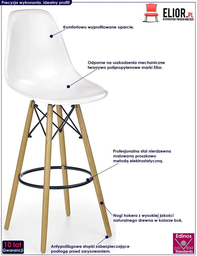 Oryginalny i komfortowy hoker Esso wyróżnia się nie tylko swoją unikalną formą, ale także zastosowaniem materiałów najlepszej jakości. Designerskie białe oparcie oraz siedzisko mebla wykonane są z profesjonalnego tworzywa polipropylenowego marki Elior, co gwarantuje Ci wyjątkową wygodę użytkowania. Materiał ten charakteryzuje się ponadprzeciętną wytrzymałością mechaniczną, jest również łatwy do utrzymania w czystości i można go przecierać na mokro (co jest szczególnie ważne w przypadku artykułów używanych podczas posiłków). Profil mebla w kolorze buk stworzony został z naturalnego drewna wolnego od alergenów, a następnie zabezpieczonego hipoalergiczną emulsją wodną. Komfortową podpórkę na stopy wyprodukowano z najwyższej jakości nierdzewnej stali malowanej odpornym na zarysowania i zadrapania. Najwyższa jakość techniki polimeryzacji pozwoliła zaoferować firmie Elior aż 10 lat gwarancji na swoje produkty. Już nie musisz się martwić, że po kilku latach część farby odpryśnie od mebla . Stonowana kolorystyka i prosta forma sprawiają, że krzesło doskonale odnajduje się we wnętrzach urządzonych w stylu skandynawskim, jak też minimalistycznym czy nowoczesnym. Krzesło marki Elior zapewnia Ci niezapomniane chwile przy stole w gronie przyjaciół i rodziny. Wnieś do swojego wnętrza nastrojowy klimat, harmonizując go z czystością prawdziwej bieli!