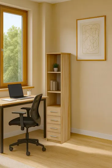 - Dwie pojemne półki oraz cztery szuflady do przechowywania.