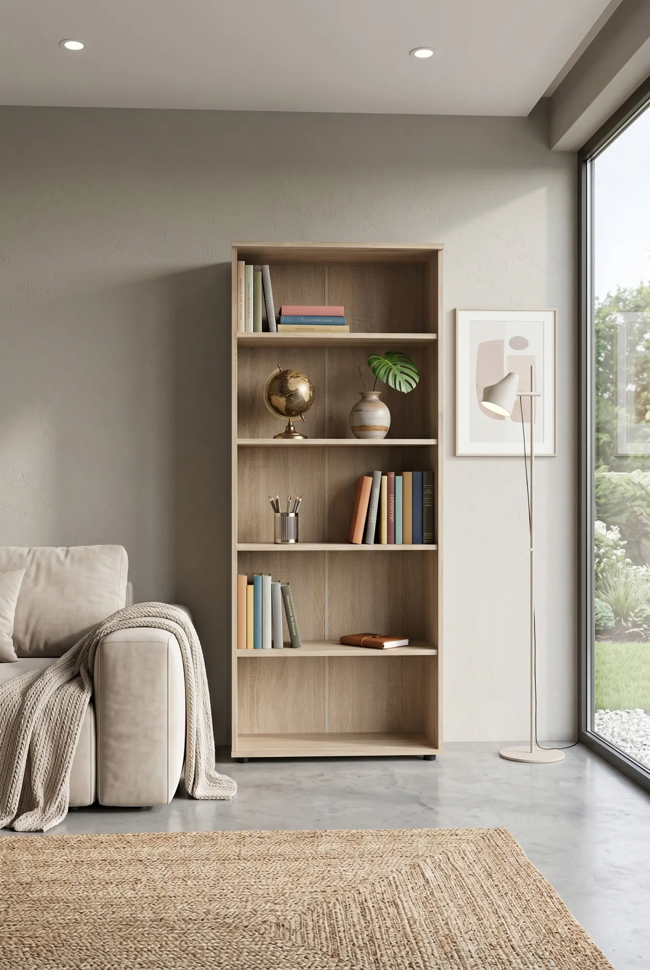 Aranżacja salonu z regałem na książki dąb sonoma Hagen
