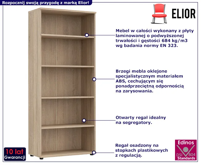 • Przestronność: Pięć szerokich półek zapewnia dużo miejsca na przechowywanie wszystkich twoich segregatorów i dokumentów.