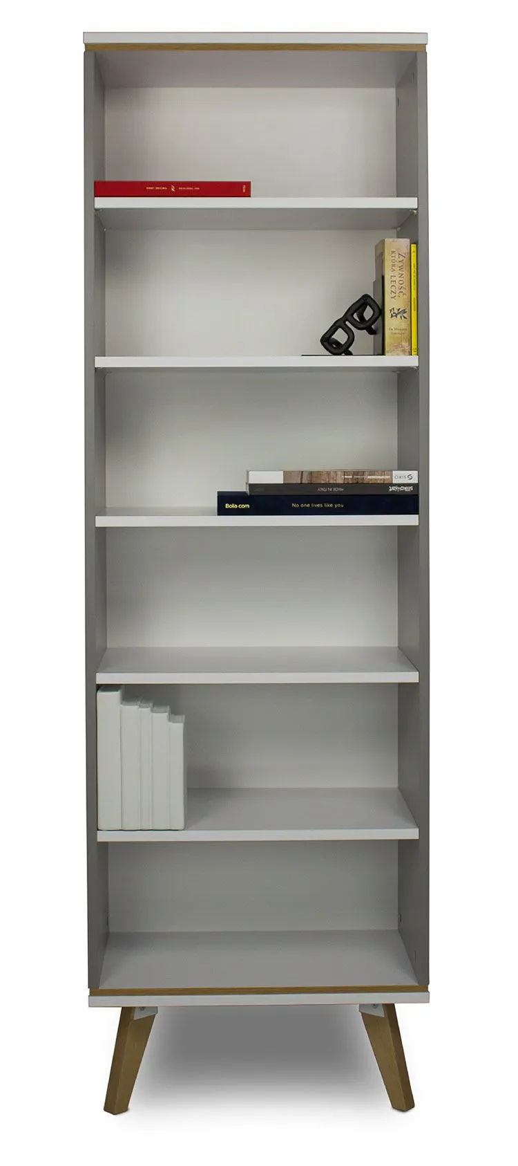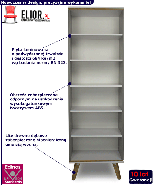 Lubisz, gdy wszystko znajduje się na swoim miejscu? Rozglądasz się za meblem, który stanie się kropką nad "i" w Twojej aranżacji? Mamy dla Ciebie doskonałą propozycję! Regał Ivon 6X - prosty, elegancki, niesamowicie funkcjonalny! Idealne dopełnienie harmonijnej aranżacji z miejscem na przeróżne przedmioty oraz dodatki. Ponieważ dodatki mają ogromne znaczenie we wnętrzu (decydują one aż w 70% o efekcie końcowym aranżacji) warto zadbać o odpowiednie miejsce na którym je ustawimy. Zdjęcia, pamiątki z wakacji, książki, wazony i świece - wszystko to znajdzie swoje miejsce na regale Ivon 6X. Ten prosty, a zarazem elegancki mebel wprowadzi do Twojego wnętrza niepowtarzalny, przytulny klimat. Ivon 6X posiada w sumie sześć półek, cztery z nich mają możliwość regulacji wysokości. Jedna z półek - środkowa, umocowana została na stałe, co wzmacnia konstrukcję całego mebla. Korpus regału jest w intrygującym odcieniu szarości, a półki oraz wieniec górny i dolny w kolorze subtelnej bieli. Między blatem, a półkami został zastosowany dodatkowy element ozdobny w postaci lekko cofniętego mniejszego blatu, który wykończono drewnianym dekorem. Solidne nogi mebla, które dodają całości niepowtarzalnej lekkości wykonane zostały z wysokogatunkowego, litego drewna dębowego, zabezpieczonego hipoalergiczną emulsją wodną. Regał Ivon 6X wykonany został z naturalnej płyty meblowej zbudowanej z włókien drzewnych i związków organicznych w warunkach wysokiego ciśnienia i temperatury. Włókna ułożone są różnokierunkowo, o strukturze sinusoidalnej, co zapewnia nadanie jej cech jakościowych oraz wytrzymałościowych. Dodatkowo płyta została uszlachetniona cienkimi filmami melaminowymi w celu zwiększenia jej trwałości. Brzegi mebla oklejono specjalistycznym materiałem ABS, cechującym się ponadprzeciętną odpornością na zarysowania. Ponadto ten zabieg sprawił, że regał prezentuje się wyjątkowo estetycznie. Ivon 6X to świetne rozwiązanie zarówno do salonu jak i biura lub pokoju dziecięcego.