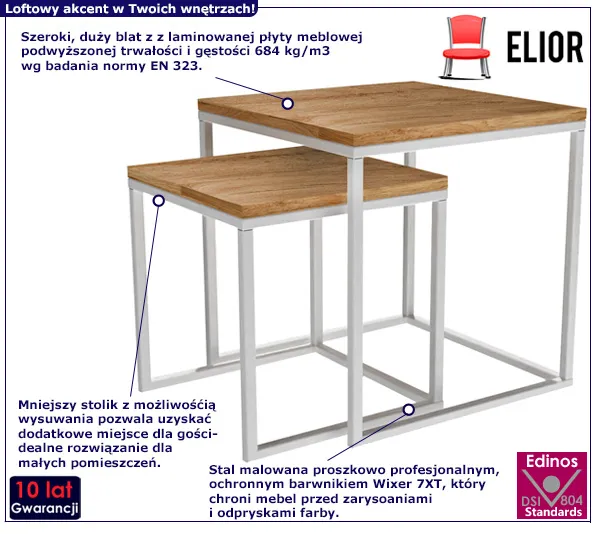 W Elior czerpiemy ze sprawdzonych rozwiązań, dlatego blat stolika kawowego Solento 3Z naszej marki został wykonany z laminowanej płyty meblowej o podwyższonej trwałości i gęstości. Stabilną konstrukcję oparliśmy na niezawodnej stali malowanej proszkowo : uchroni on mebel przed nieestetycznymi zadrapaniami, odpryskami farby oraz uszkodzeniami mechanicznymi i zarysowaniami.
