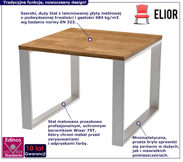 W Elior wiemy, że dobry projekt to nie wszystko. Dlatego nasze produkty tworzymy z wyselekcjonowanych, starannie dobranych i trwałych materiałów. Chcemy, byś meblował dom na lata, a nie tygodnie. W przeciwieństwie do konkurencyjnych firm nie opieramy produkcji na tanich, szkodliwych, wątpliwej jakości zamiennikach. Stolik kawowy Rodos 3Z marki Elior jest tego najlepszym przykładem. W prostej, minimalistycznej formie spotkały się jedne z najbardziej solidnych, wytrzymałych materiałów. Blat mebla z wysokogatunkowej laminowanej płyty meblowej o podwyższonej trwałości i gęstości. Konstrukcja ze stali odpornej na odkształcenia, malowana proszkowo . Emulsja uchroni nóżki przed zadrapaniami i nieestetycznymi odpryskami farby. Najwyższa jakość techniki polimeryzacji pozwala nam zaoferować aż 10 lat gwar. na swoje produkty! Zapomnisz o stresie, że po kilku latach część farby odpryśnie od mebla, tak jak u produktów konkurencyjnych firm.