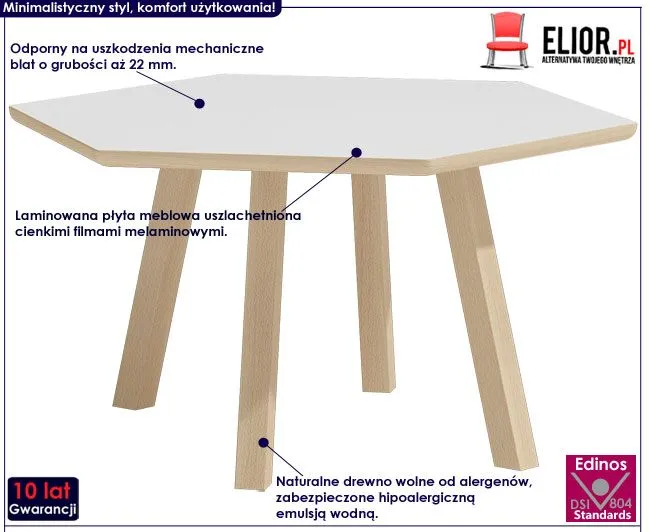 Przedstawiamy Ci zachwycającą ławę Ivos 8X marki Elior. Wyróżnia się ona nie tylko swoją praktyczną formą i efektownym kształtem, ale także zastosowaniem materiałów najlepszej jakości. To dlatego cieszy się powodzeniem wśród osób lubiących nowatorskie rozwiązania. Designerski, sześciokątny blat stolika w kolorze białym wykonany został z laminowanej płyty meblowej o klasie higieny E1, uszlachetnionej cienkimi filmami melaminowymi. Posiada także specjalne włókna ułożone różnokierunkowo o strukturze sinusoidalnej, co zapewnia nadanie jej cech jakościowych oraz wytrzymałościowych. Nogi mebla wyprodukowano z naturalnego drewna wolnego od alergenów, a następnie zabezpieczonego hipoalergiczną emulsją wodną. Gwarantuje to ławie ponadprzeciętną trwałość i niepodatność na uszkodzenia. Stonowana kolorystyka i prosta forma sprawiają, że stolik kawowy Lindo doskonale sprawdza się we wnętrzach urządzonych w stylu skandynawskim, jak też minimalistycznym czy nowoczesnym. Świetnie nadaje się także do wnętrz dziecięcych czy młodzieżowych. Ława zapewnia Ci niezapomniane chwile przy kawie w gronie przyjaciół i rodziny. Wnieś do swojego wnętrza nastrojowy klimat, harmonizując go z czystością prawdziwej bieli!