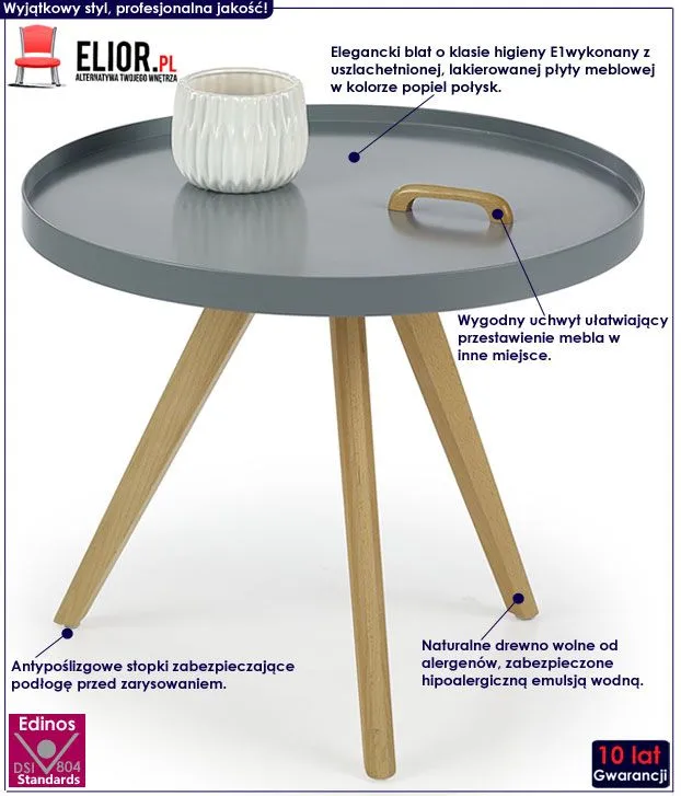 Z przyjemnością przedstawiamy Ci zachwycającą ławę Sevri marki Elior. Produkty Elior charakteryzują się wyrazistym designem i dbałością o każdy detal mebla, a wdzięk i nowoczesność, jak również mocna i stabilna konstrukcja, to cechy najnowszego stolika Sevri. Wyróżnia się on nie tylko swoją praktyczną formą i eleganckim kształtem, ale także zastosowaniem materiałów najlepszej jakości. To dlatego cieszy się on powodzeniem wśród osób lubiących nowatorskie rozwiązania. Designerski, okrągły blat ławy wykonany został z lakierowanej płyty meblowej o klasie higieny E1, uszlachetnionej cienkimi filmami melaminowymi. Posiada także specjalne włókna ułożone różnokierunkowo o strukturze sinusoidalnej, co zapewnia nadanie jej cech jakościowych oraz wytrzymałościowych. Nogi mebla wyprodukowano z naturalnego drewna wolnego od alergenów, a następnie zabezpieczonego hipoalergiczną emulsją wodną. Gwarantuje to ławie ponadprzeciętną trwałość i niepodatność na uszkodzenia. Praktycznym dodatkiem stolika jest komfortowy uchwyt, dzięki któremu szybko i łatwo przeniesiesz mebel tam, gdzie akurat jest Ci potrzebny. Stonowana kolorystyka i prosta forma sprawiają, że stolik kawowy Sevri doskonale sprawdza się we wnętrzach urządzonych w stylu skandynawskim, jak też minimalistycznym czy nowoczesnym. Ława zapewnia Ci niezapomniane chwile przy filiżance kawy w gronie przyjaciół i rodziny. Wnieś do swojego wnętrza nastrojowy klimat, harmonizując go z jakże modną szarością!