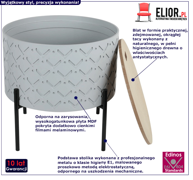 - Produkt posiada certyfikat jakości "Edinos Standards DSI 804", który potwierdza najwyższą jakość wykonania mebla oraz pełny stopień zgodności poszczególnych jednostek wytworzonego wyrobu z przyjętym wzorcem.