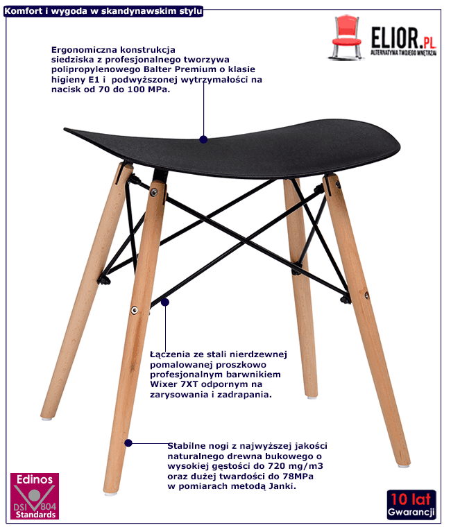Lekkość, doskonała jakość i solidne wykonanie to połączenie cech stanowiących o rzeczywistej wartości taboretu Edisos. Siedzisko wyróżniające się ergonomiczną konstrukcją wykonaliśmy z profesjonalnego, polipropylenowego tworzywa Balter Premium o klasie higieny E1. Co więcej, stopień jego wytrzymałość na nacisk to aż 70 do 100 MPa. Najwyższej klasy drewno bukowe, wykorzystane do produkcji nóg taboretu posiada również bardzo korzystne właściwości, mające bezpośredni wpływ na jakość mebla. Są nimi duża gęstość do 720 mg/m3, oraz wysoka twardość do 78 MPa w pomiarach metodą Janki. Łączenia nóg to nie tylko element dekoracyjny, lecz również wzmacniający konstrukcję i stabilność taboretu. Wykonaliśmy je z pomalowanej proszkowo stali nierdzewnej, zaś użyty w tym celu profesjonalny barwnik  ma za zadanie chronić łączenia przed zarysowaniem i zadrapaniem. Antypoślizgowa podstawa wykańczająca nogi taboretu zabezpiecza podłogę przed zarysowaniem.