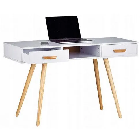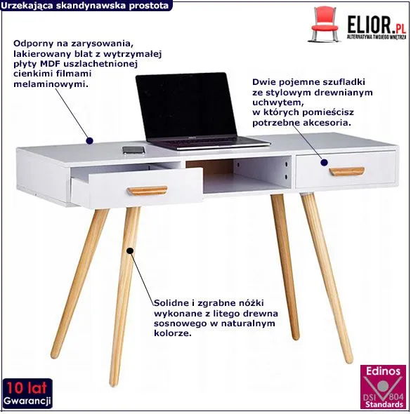 Wybierając nasz produkt dbasz zarówno o najwyższą jakość oraz praktyczność stosowanych materiałów. Jest to też dowód na Twoje świadome decyzje konsumenckie sprzyjające środowisku naturalnemu. Blat, który wykazuje się niską porowatością nie wchłania plam ani innych zabrudzeń, więc nie musisz martwić się przypadkowym wylaniem kawy przy pracy, ponieważ bez problemu doprowadzisz biurko do porządku. Biurko jest także wyposażone w dwie pojemne szuflady otwierane stylowymi drewnianymi uchwytami oraz we wnękę pomiędzy nimi: możesz przechować tam wszystkie przedmioty, które lubisz mieć pod ręką (długopisy, zeszyty, książki, kalkulator, telefon...). Ułatw i uprzyjemnij sobie czas pracy sprawiając sobie prezent w postaci świetnego białego biurka Izuru marki Elior.