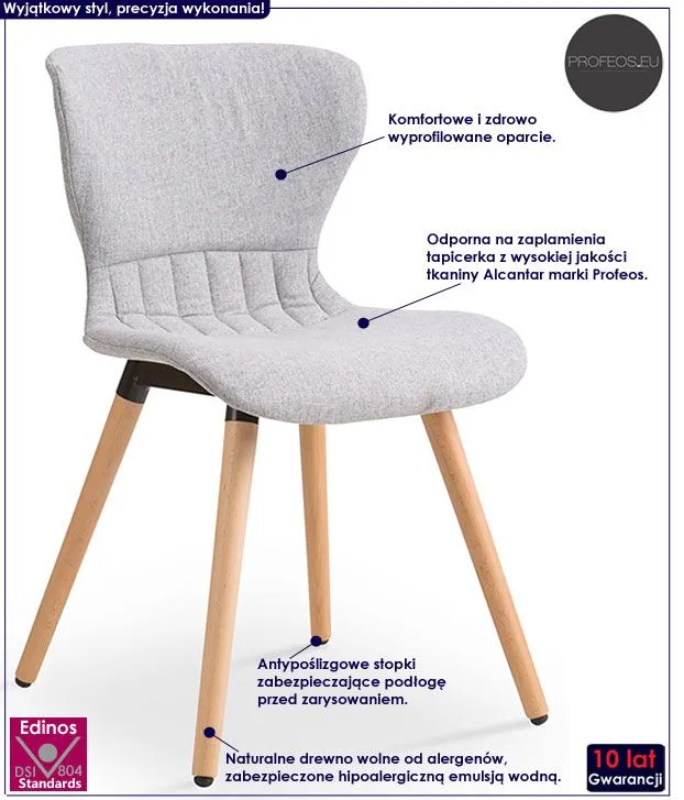 Oryginalne i komfortowe krzesło profilowane Gracio wyróżnia się nie tylko swoją unikalną formą, ale także zastosowaniem materiałów najlepszej jakości. Designerska tapicerka w kolorze jasnoszarym wykonana została z wysokiej jakości tkaniny Alcantar Pro, charakteryzującej się dużą odpornością na ścieranie i zabrudzenie oraz niezwykłą miękkością w dotyku (dzięki warstwie poliuretanu). Tkanina Alcantar Pro marki Profeos, która jako jedyna na rynku produkowana jest z dokładnie wyselekcjonowanych ultramikrowłókien o objętości aż do 24-razy drobniejszej od ludzkiego włosa, charakteryzuje się wyjątkową żywotnością, odpornością oraz niezwykłą łatwością w utrzymaniu. Posiada ponadprzeciętne cechy wytrzymałościowe, dzięki czemu unikniesz co sezonowej wymiany tapicerki. Tkanina Alcantar jest także bardzo praktyczna i można ją czyścić na mokro, co jest niezwykle istotne w przypadku mebli wykorzystywanych podczas posiłków. Profil mebla stworzony został z naturalnego drewna wolnego od alergenów, a następnie zabezpieczonego hipoalergiczną emulsją wodną. Stonowana kolorystyka i prosta forma sprawiają, że krzesło doskonale odnajduje się we wnętrzach urządzonych w stylu skandynawskim, jak też minimalistycznym czy nowoczesnym. Gracio zapewnia Ci niezapomniane chwile przy stole w gronie przyjaciół i rodziny. Z powodzeniem sprawdza się też jako wygodny fotel do biurka. Wnieś do swojego wnętrza nastrojowy klimat, harmonizując go z ciepłem naturalnych barw!