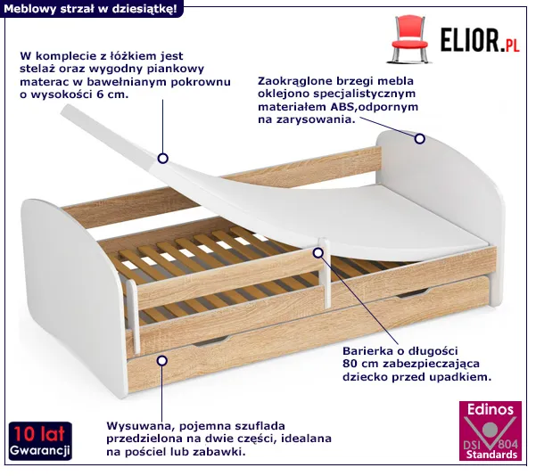 Jeśli jesteś zmęczona ciągłym wstawaniem w nocy, bo Twój maluch znowu pojawił się w Twoim łóżku, nie czekaj dłużej, aż z tego wyrośnie- takie cuda się nie zdarzają! Łóżko dziecięce Elea 5X marki Edinos Premium, to model mebla charakteryzujący się oryginalnym designem dostosowanym do upodobań dziecka. Gwarancją bezpieczeństwa jest barierka z boku łóżka, która zabezpieczy dziecko przed upadkiem. Profesjonalnie wykonany stelaż, na którym został ułożony, dołączony do kompletu, materac to bezpieczeństwo i ochrona dla Twojego dziecka. Zaokrąglone obrzeża uchronią nawet największego skoczka podczas fikołków na łóżku przed solidnym guzem. Łóżko dziecięce Elea 5X posiada również cechy, które zaimponują rodzicom. Praktyczna i funkcjonalna szuflada na kółkach o optymalnych wymiarach pozwoli na umieszczenie w niej pościeli, zabawek, miśków i innych rzeczy, które dziecko pragnie mieć w zasięgu ręki. Teraz nie masz już wymówek, wszystkie zalety łóżka Elea 5X marki Edinos Premium wskazują, że to numer jeden, jeżeli chodzi o wygodę i bezpieczeństwo Twojego dziecka podczas snu. Nie pozostaje Ci nic innego jak tylko dokonać zakupu!