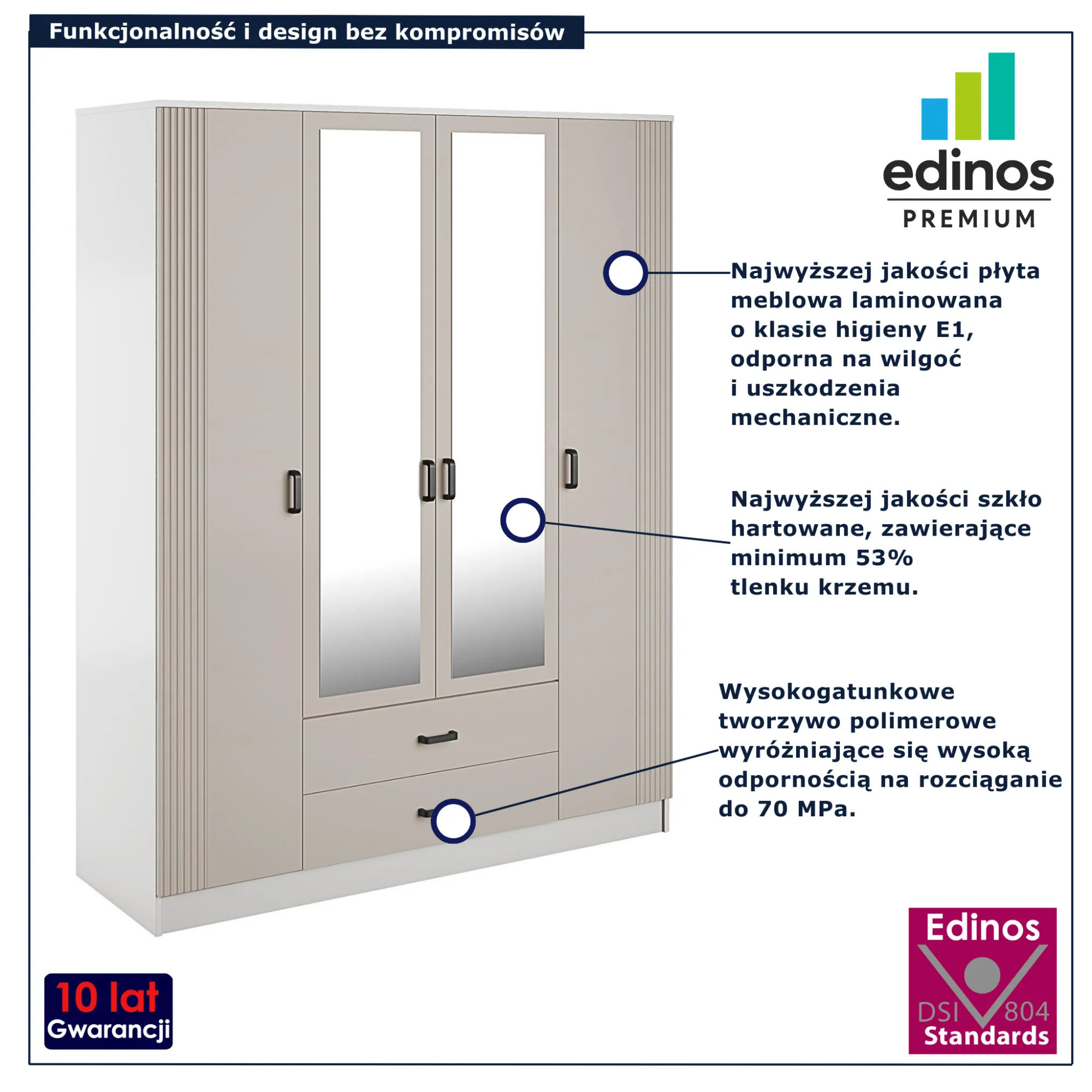 • Produkt posiada certyfikat jakości "Edinos Standards DSI 804", który potwierdza najwyższą jakość wykonania mebla oraz pełny stopień zgodności poszczególnych jednostek wytworzonego wyrobu z przyjętym wzorcem.